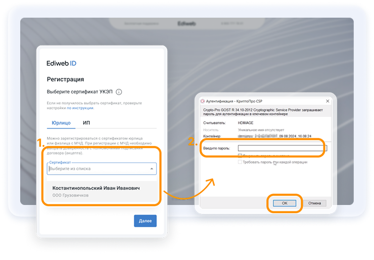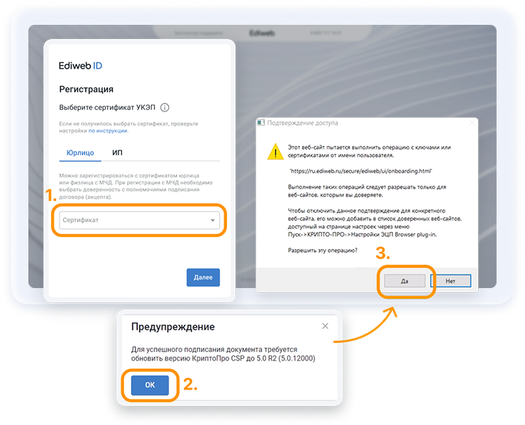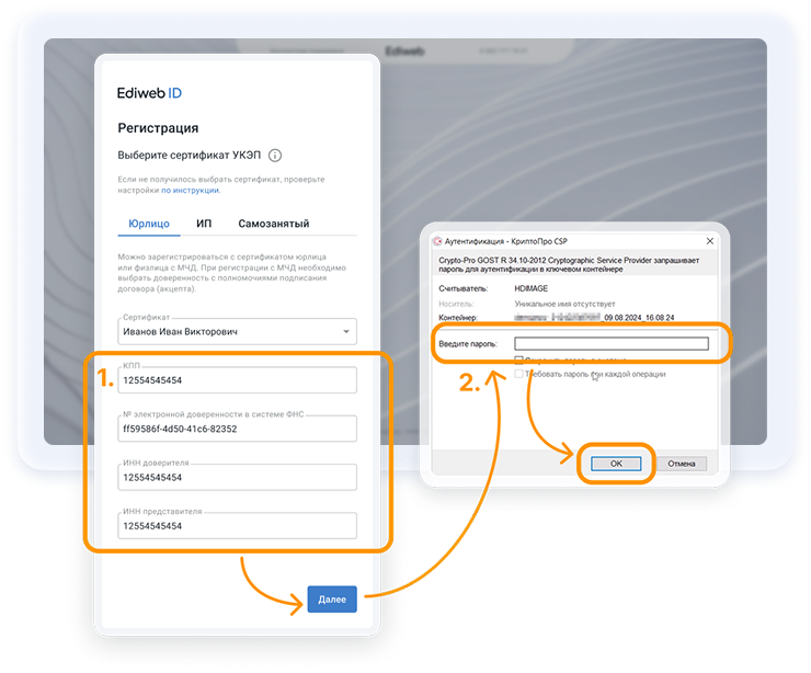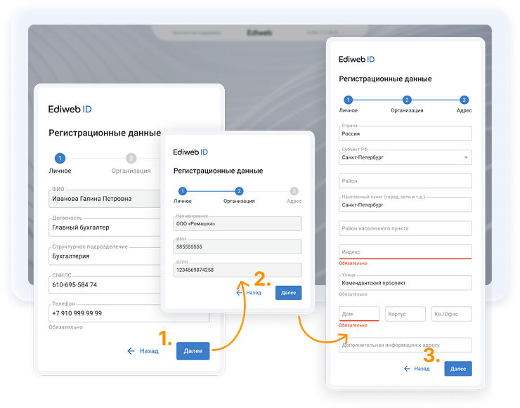 Далее три шага ввода регистрационных данных. Информация подтянется из сертификата автоматически.