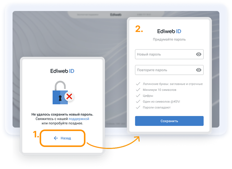 - Если будет ошибка, то при сохранении пароля отобразится форма. Можно вернуться на шаг назад.