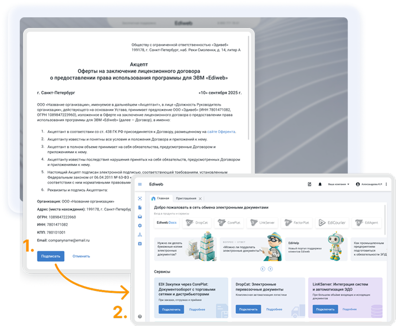 - Когда войдете в аккаунт, подпишите: «Акцепт Оферты на заключение лицензионного договора о предоставлении права использования программы для ЭВМ Ediweb».